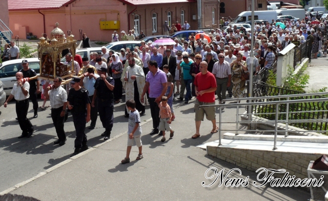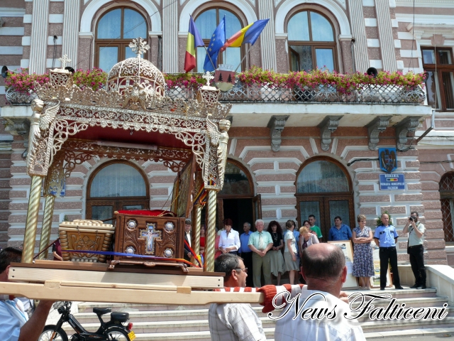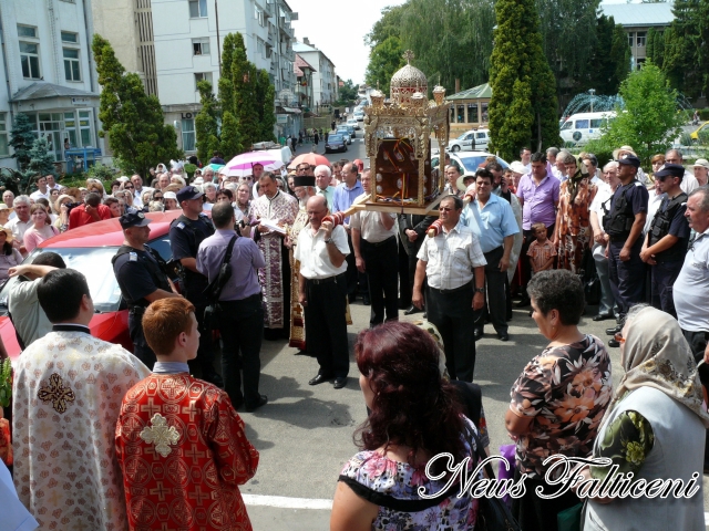Primul popas a fost făcut în faţa Spitalului Municipal, unde soborul de preoţi s-a rugat pentru sănătatea celor aflaţi în această unitate medicală. Următoarea oprire a fost la Biserica “Adormirea Maicii Domnului”, unde sfintele moaşte au fost întâmpinate de credincioşi şi de preotul paroh Teodor Brădăţanu. În faţa Primăriei Fălticeni preoţii şi sfintele moaşte au fost aşteptate de funcţionarii instituţiei, de primarul Cătălin Coman şi de viceprimarul Gheorghe Aldea. La fiecare orpire, procesiunea era întâmpinată de alte câteva zeci de oameni, credincioşii înghesuindu-se să atingă cele două racle şi să fie stropiţi cu agheasmă de către preoţi.
