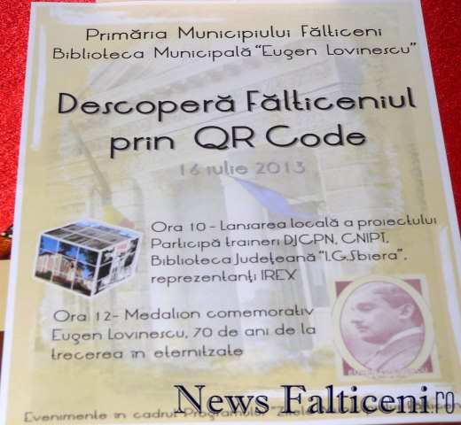 Marţi, 16 iulie, la Biblioteca Municipală „Eugen Lovinescu”, din Fălticeni a avut loc lansarea proiectului „Descoperă Fălticeniul prin QR Code”, ca parte componentă a proiectului judeţean „Descoperă Suceava prin QR Code”. Pe lângă tinerii implicaţi în proiect, la prima întâlnire au participat Ioan Ilişescu, consilier al Direcţiei Judeţene pentru Cultură, Culte şi Patrimoniu Naţional, Dana Tofan, şef Serviciul Cultură – Muzee în cadrul Primăriei Fălticeni, Claudia Suseanu, directoarea Colegiului „Mihai Băcescu”, prof. Bogdan Feştilă, Bogdan Anichiforesei, coordonator regional IREX, Claudiu Brădăţanu, reprezentant al Centrului Naţional de Informare Turistică Suceava, Lăcrămioara Cocuz, iniţiatoarea proiectului.