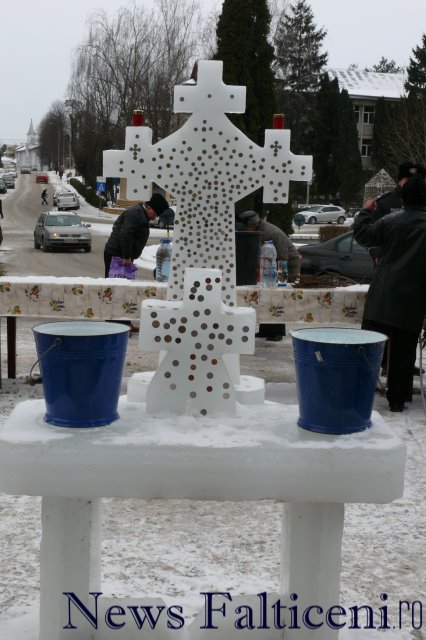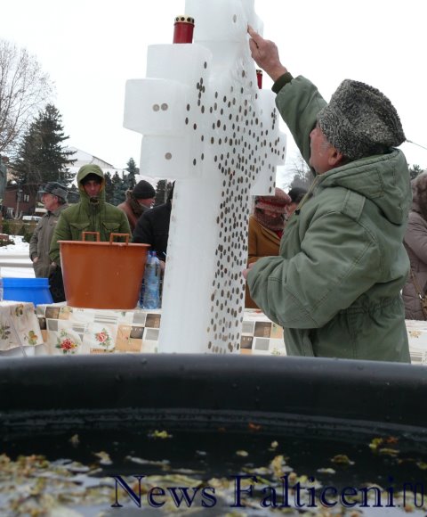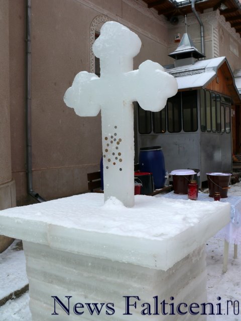 Preoţii de la Biserica “Adormirea Maicii Domnului” au pregătit pentru slujba de Bobotează de ieri o cruce de gheaţă înaltă de peste doi metri, pe care au pus un vas cu grâu încolţit, dar şi o cruce mai mică aşezată pe o masă din gheaţă. Crucea a fost montată în ajunul Bobotezei, iar tradiţia spune că dacă crucea începe să se dezgheţe, anul va fi bogat, iar dacă va rămâne îngheţată, anul va fi secetos şi sărac.Mulţi din cei care au trecut pe strada Republicii s-au oprit în faţa bisericii pentru a lipi o monedă pe crucea de gheaţă în timp ce-şi pun o dorinţă. Oamenii cred că, dacă banul se lipeşte de prima dată, dorinţa se va îndeplini, iar dacă vei lua moneda de pe cruce vei avea un an plin de ghinion. După slujba de sfinţire a agheasmei oficiată lângă crucea de gheaţă de preoţii Adrian şi Teodor Brădăţanu, credincioşii au primit apă sfinţită.