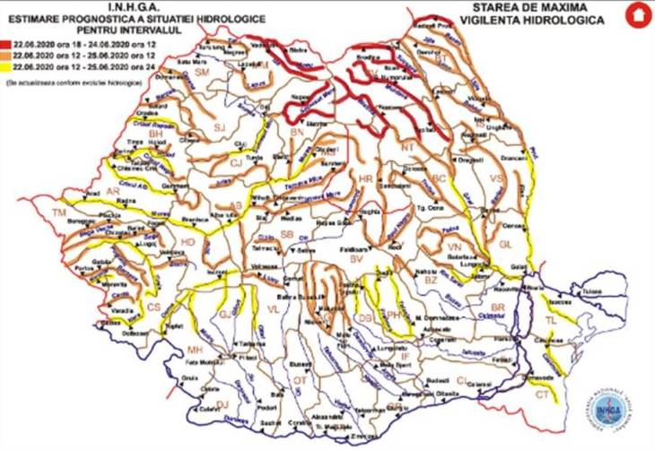 Institutul Naţional de Hidrologie şi Gospodărire a Apelor a emis luni mai multe avertizări, din care una cod roşu de inundaţii valabilă până miercuri pe râuri din şapte judeţe. Conform hidrologilor, în intervalul luni ora 18:00 – miercuri ora 12:00, pe râuri din judeţele Suceava, Maramureş, Bistriţa Năsăud, Neamţ, Harghita, Bacău şi Botoşani se pot produce fenomene hidrologice periculoase. Cele mai multe probleme vor fi pe unele râuri din judeţele Suceava, Neamţ şi Botoşani, ȋn intervalul marţi ora 9:00 – ora 24:00.