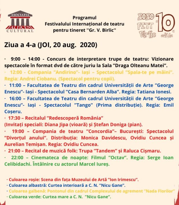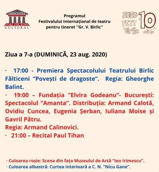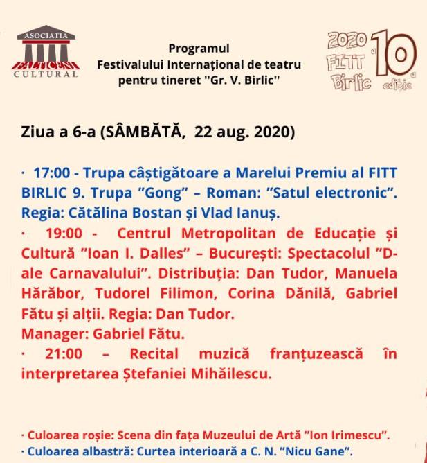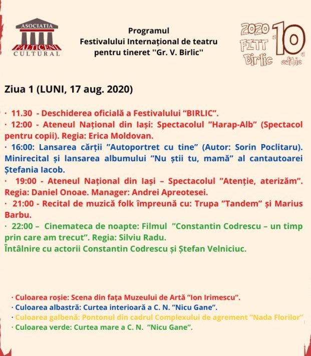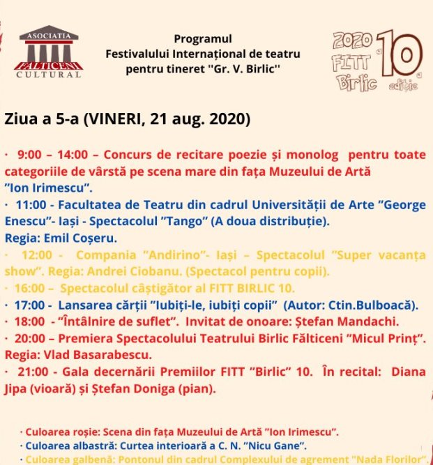 Secţiunea Monolog/Recitare, secţiune care se adresează copiilor şi tinerilor având vârsta cuprinsă între 7 – 25 de ani, se va desfăşura pentru toate categoriile de vârstă vineri, 21 august, între orele 9,00 – 14,00, pe scena din faţa Muzeului de Artă “Ion Irimescu”. Gala decernării Premiilor „Birlic” 10 va avea loc vineri, 21 august, de la ora 21,00.