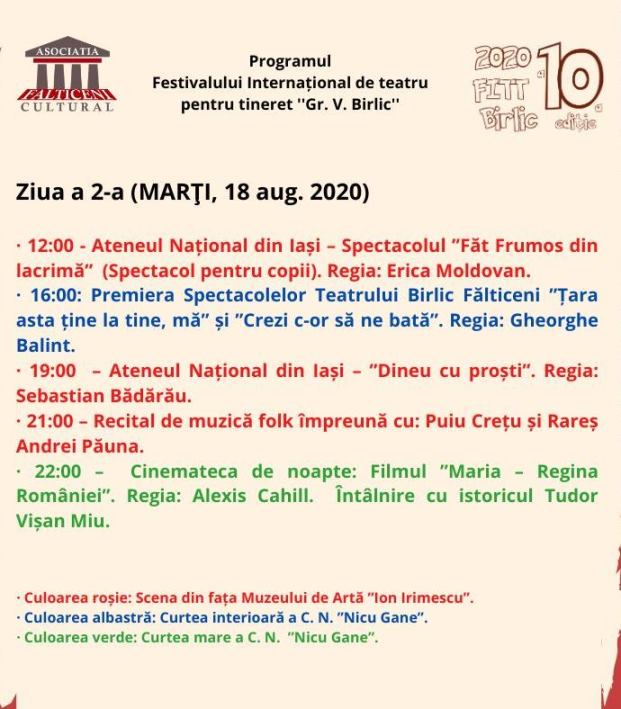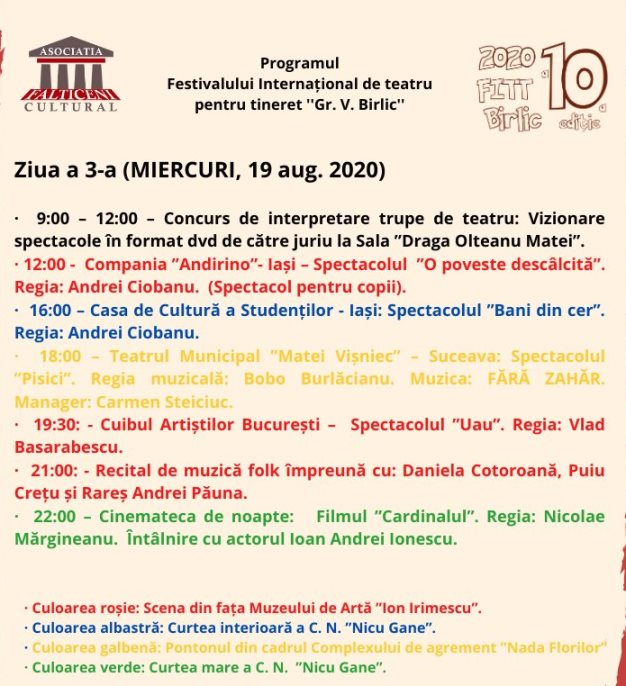 În perioada 17 – 23 august, la Fălticeni, se va desfăşura a zecea ediţie a Festivalului Internaţional de Teatru pentru Tineret „Grigore Vasiliu Birlic” (FITT Birlic 10). La ediţia din acest, jurizarea secţiunii dedicate trupelor de teatru din ţară şi străinătate, trupe formate din liceeni şi tineri având vârsta cuprinsă între 14 şi 25 de ani, se va face în urma vizionării de către juriul format din actorii şi regizorii Dan Tudor, Gheorghe Balint, Silvia Ghilaş, Ana Maria Fasolă şi profesorul de limba română Neculai Sturzu, a înregistrărilor video cu piesele înscrise în concurs, vizionare care se va face miercuri 19 august şi joi, 20 august.