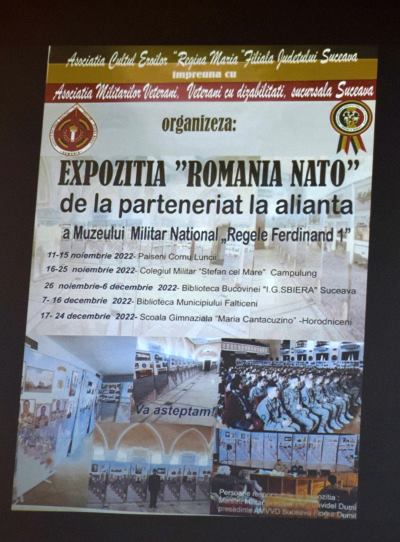 Biblioteca Municipală „Eugen Lovinescu” din Fălticeni, a găzduit joi, 8 decembrie 2022, vernisajul expoziţiei „România – NATO – De la parteneriat la alianţă în lupta împotriva terorismului, pentru o lume mai sigură şi mai bună”, care include 38 de bannere, care pe lângă istoric prezintă fotografiile şi prezentarea celor 29 de militari români căzuţi în teatrele de operaţii.