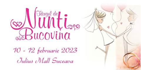 Participarea la târgurile de nunți este un „must go” pentru miri, iar în perioada 10-12 februarie 2023, Târgul de nunți ,,Bucovina” din Iulius Mall Suceava te întâmpină, la etajul 1, cu cele mai bune oferte pentru ca tu să poți începe pregătirile de nuntă. Ca să-ți fie mai ușor, fă-ți un checklist, ia-ți timpul necesar pentru a vorbi cu furnizorii și nu rata niciun stand pentru că toți au pregătit surprize.